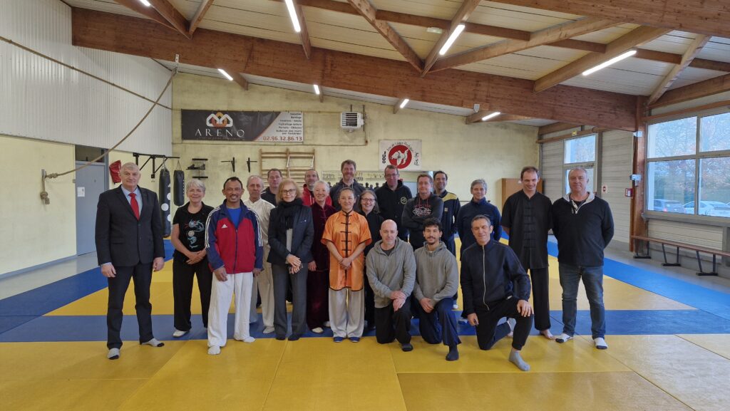 Les Samedi 22 et Dimanche 23 Novembre 2025 se déroulaient à Dirinon un stage de massage dans le cadre du Qigong et des Arts Energetiques Chinois ( massages des mains et des bras ) ,suivi le dimanche par un stage sur la technique de l’éventail en taiji fluide ; ces deux stages dirigés par Maître Renfeng SU 7ème Duan assisté de Josué JEAN-BAPTISTE 3ème Duan en Wushu ont permis d’approfondir encore un peu plus la circulation de l’énergie dans le corps . Deux autres stages suivront les samedi 24 et dimanche 25 janvier 2026 de 9H30 à 12H30 sur Dirinon